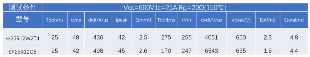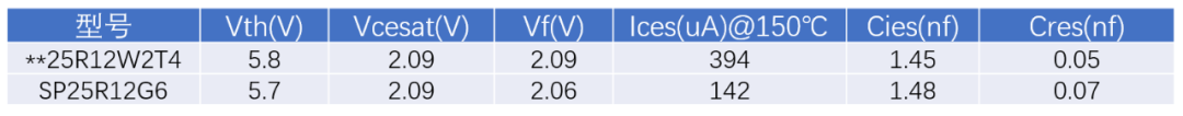 在同样的测试条件下对某I公司**25R12W2T4产品与我司SP25R12G6进行了静态与动态的测试对比,具体测试结果见表1与表2: 表1 **25R12W2T4/SP25R12G6 部分静态参数对比 表2 **25R12W2T4/SP25R12G6动态参数对比